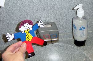 The airplane took us from Dallas Texas to Tokyo Japan. We then switched planes and flew to Beijing China. The flight took many hours. After a few hours Flat decided to get up and stretch. He took a stroll down the aisle, talked to the flight attendants, and did some exercises. Flat decided it would be fun to explore the restroom. It's called a lavatory on the airplane. It has a toilet and a place to wash your hands. The room is very small, but just right for Flat. |