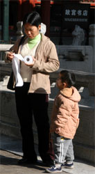 The Misconceptions Before arriving in China, we did a lot of reading on the Internet and in tour books. We had a pretty good idea what to expect when we arrived. One thing we read about was the bathrooms. Many of the tour guides said that toilet paper wasn't provided. We found that most public places like hotels and restaurants provided toilet paper. Only the heavily used tourist areas such as the Forbidden City didn't have toilet paper. The local people come to events prepared with their own supply. The woman in the photo on the right carried some in her backpack to give to her son. Another thing we'd heard was that communication could be a problem. In the tourist areas we visited you could almost always find someone who spoke English. |