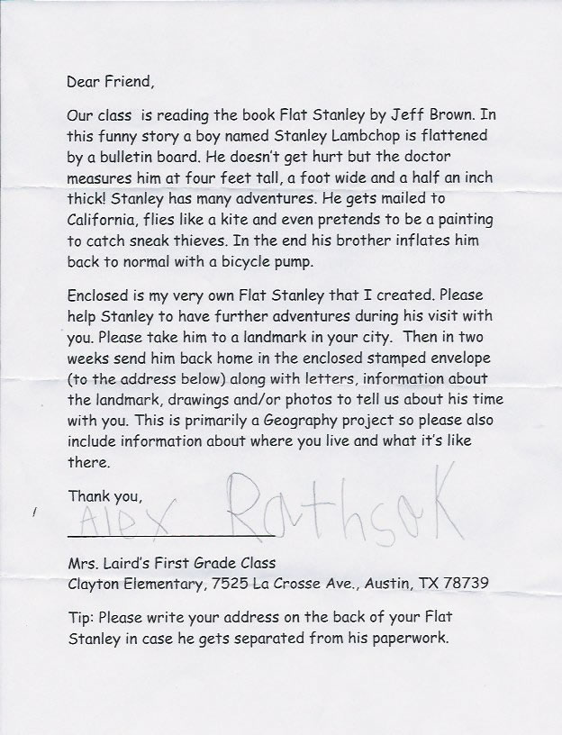 My nephew Alex Rathsack is a first grader in Mrs. Laird's class at Clayton Elementary School in Austin, Texas. Alex sent Flat Stanley for a visit in Teasdale, Utah in February 2011. Alex sent a very nice letter introducing Flat Stanley. Flat wanted to see our local landmarks. Click on the picture of Flat Stanley, Alex's letter, or Annette and Larry's letter to see it in full size.