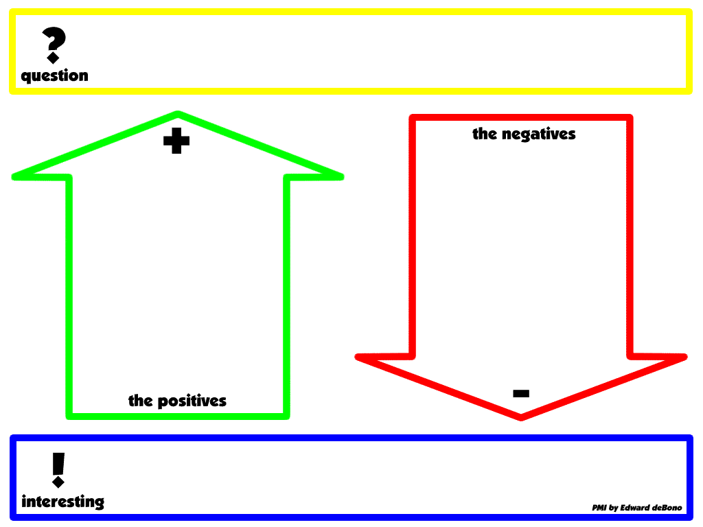 PMI. The PMI model starts with a question and an open mind. Write the question at the top of a piece of paper. Create three columns with the headings "P", "M", and I. In column "P" write for 2 minutes the positive points you can think of regardless of whether you agree or disagree. Then spend 2 minutes writing minus points in column "M". Finally, spend 2 minutes writing all the interesting points that relate to the topic. Study the results. (Edward deBono)