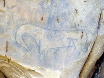 On our hike back toward the Jeep, we walked along a cliff and finally found a cavern with rock art. Although we enjoyed a great hike in a beautiful canyon area, we were a little disappointed by the rock art. Although there are a few excellent drawings (at top of page and on right), there were many areas that had been defaced. Hopefully this is not representative of the other two sites we plan to visit tomorrow. |