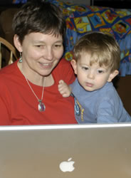 Alex continues to enjoy using the computer. He's into electronic books and sound-rich learning games. He understands that the keyboard and mouse are important, but prefers to touch the screen. |