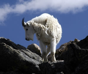 We've been in many mountainous areas; however, we've never seen mountain goats close-up. As we drove back along the tundra, Larry suddenly slowed the Jeep and pointed to the west. A small white dot could be seen on the rocks near a deep ravine. As we got closer, it was clear that this dot was a mountain goat.